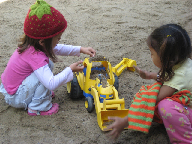 Playing in the sandbox - Lara leaves, Emily bolts out.